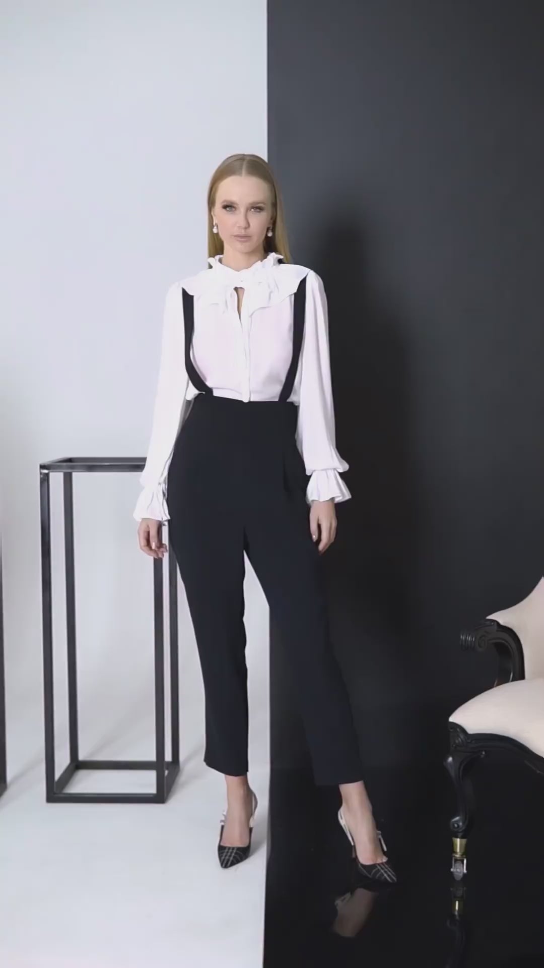 Calça corte alfaiataria cintura alta com barbatanas nas laterais, fechamento traseiro por zíper, bolso faca nas laterais e bolsos traseiros com lapela, detalhe suspensório, shape reto.